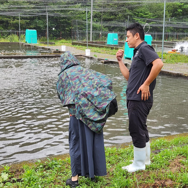あいにくのお天気でしたが、今井社長が養鱒場を案内してくれました。