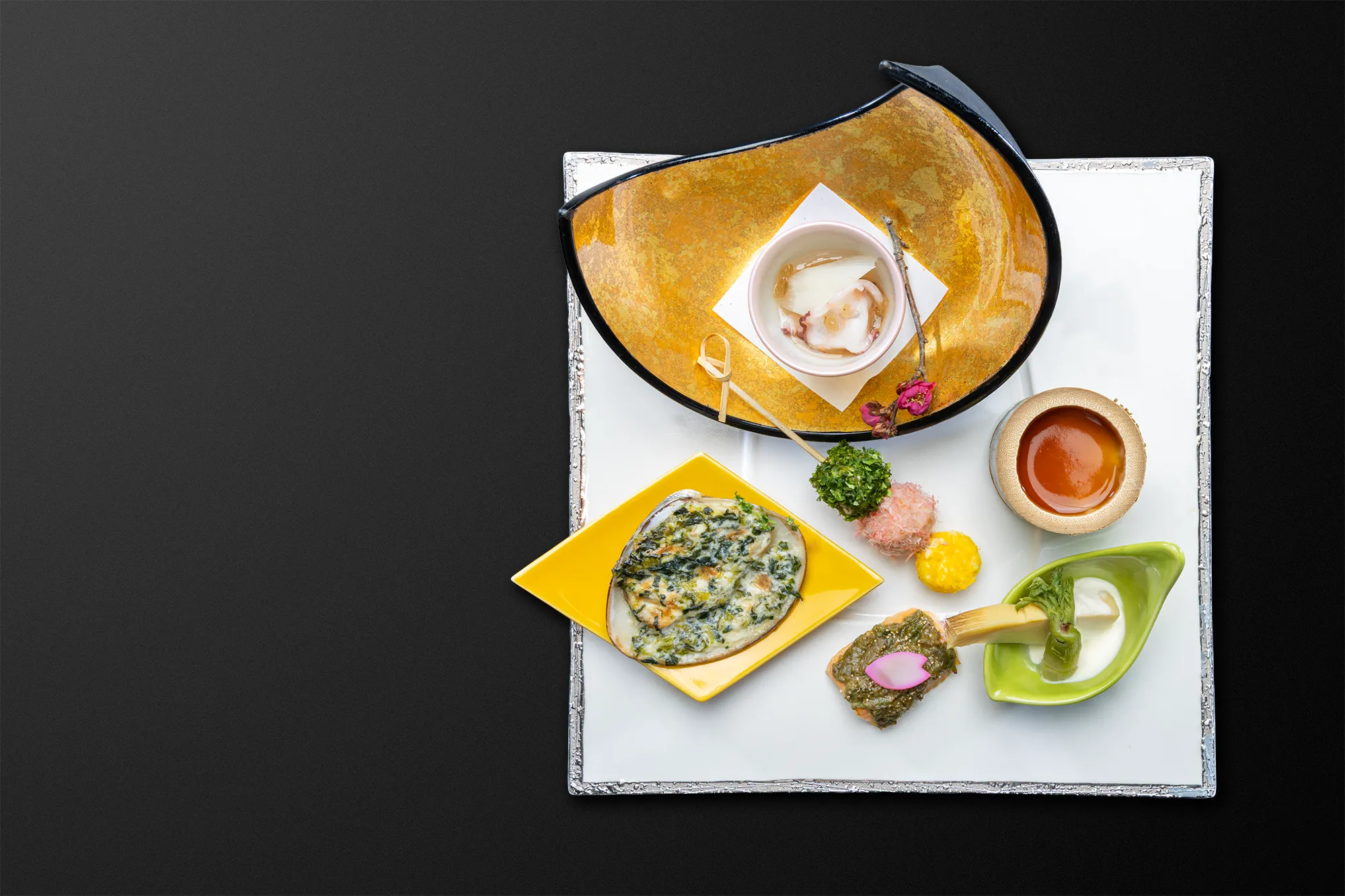蝦夷鮑と帆立を香ばしくソテーし、濃厚な肝バターソースと春野菜を添えて仕上げた一皿です。