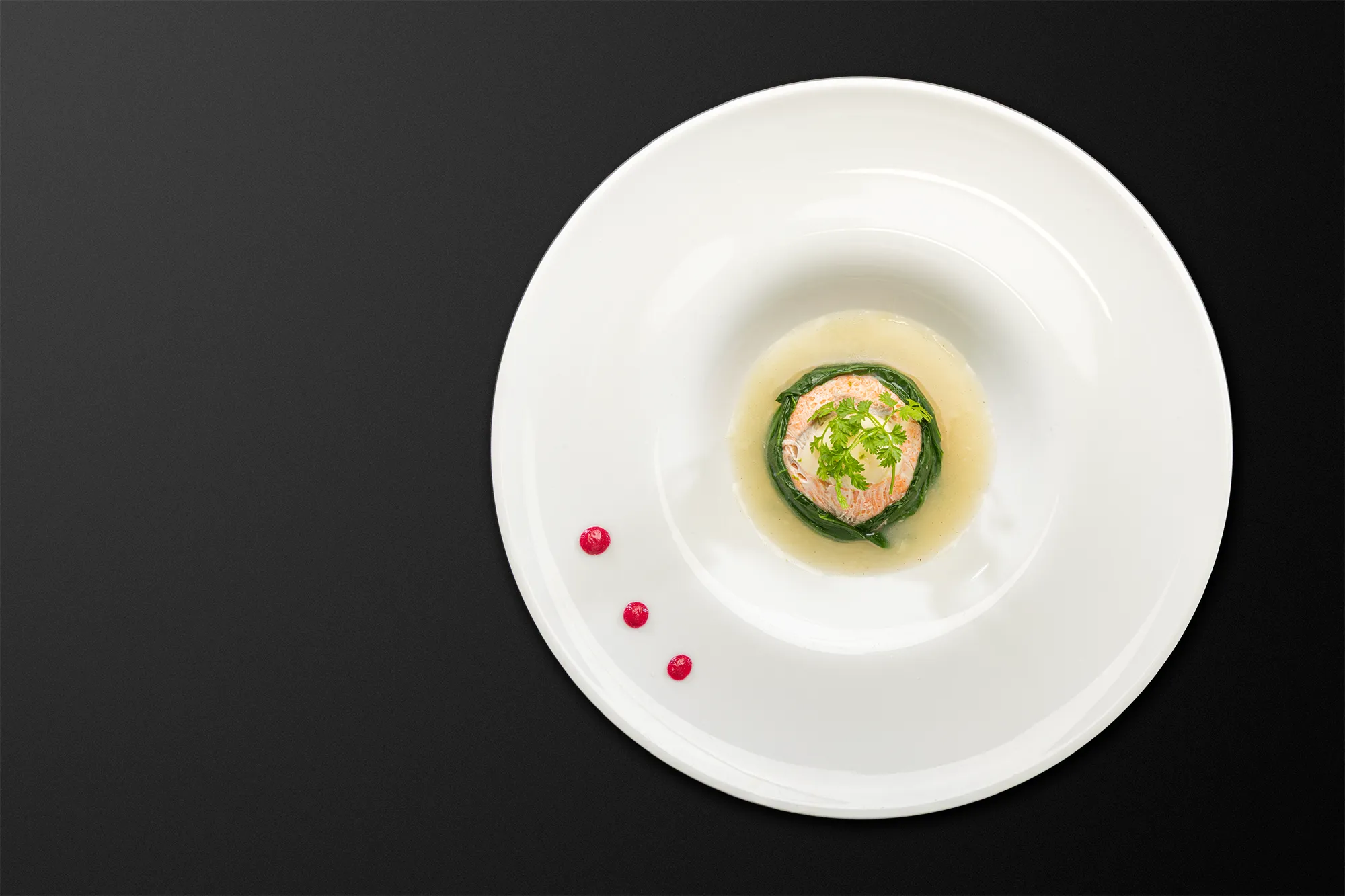 大雪サーモンと帆立をやさしく蒸し上げ、春の小松菜と山わさびの香りを添えたブルーブランソースで仕立てました。