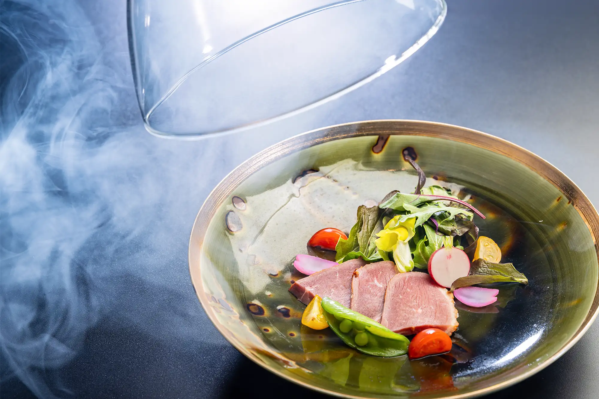 滝川産合鴨を香ばしく燻製ローストに仕立て、彩り豊かな春野菜とともに味わう一皿に仕上げました。