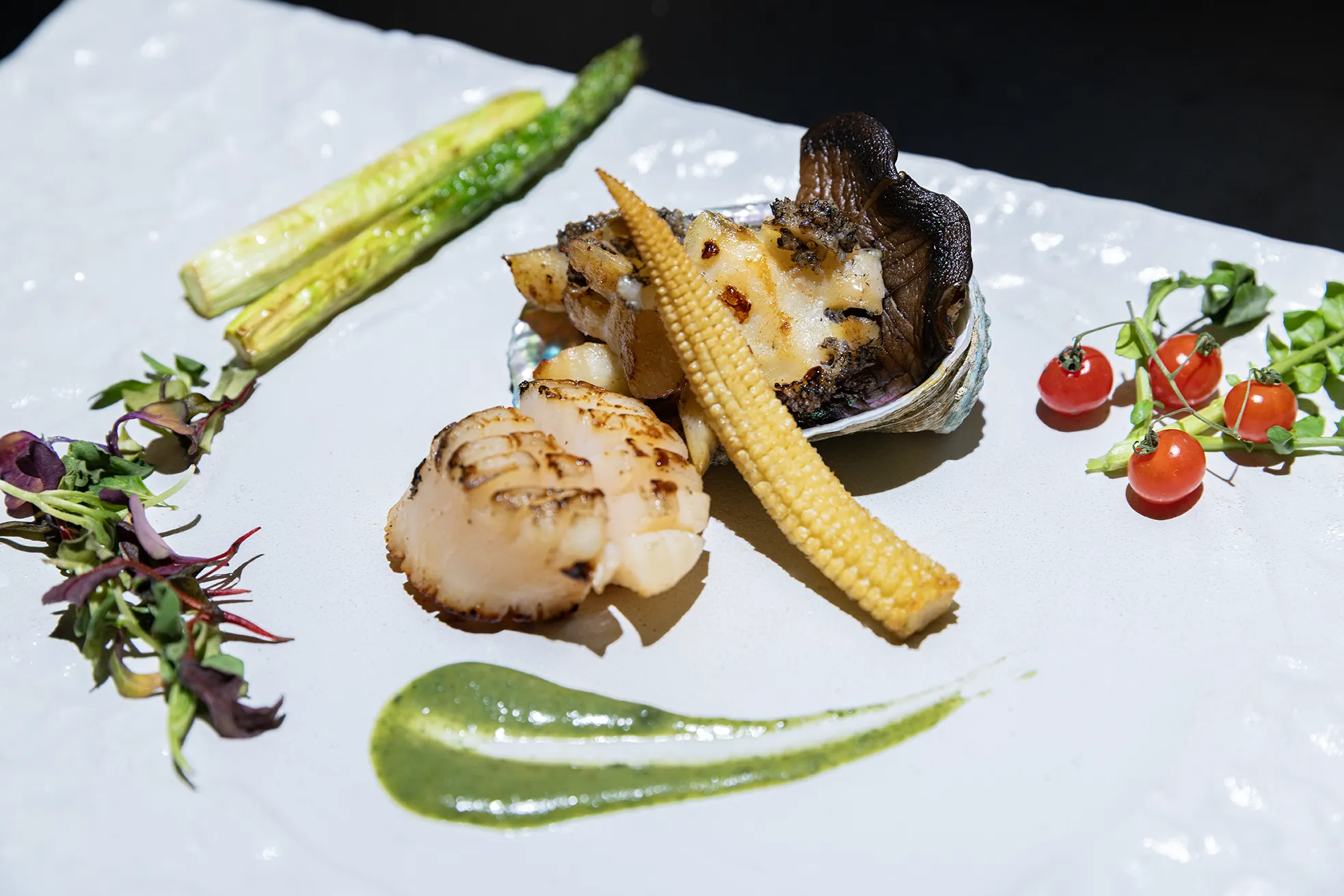 蝦夷鮑と帆立を香ばしくソテーし、濃厚な肝バターソースと春野菜を添えて仕上げた一皿です。