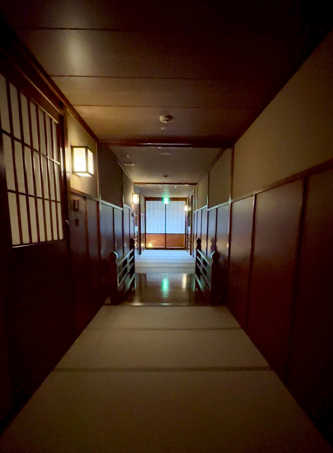 Walking down the corridor toward my room at the hotel, all those thoughts simply melted away. There, before the "Wabo Yukihana" room, was a bridge. A bridge with no river beneath it. The kind of bridge where you'd expect Ushiwakamaru and Benkei to meet (from the old tale). Just seeing this bridge filled me with satisfaction. There are no bridges in my daily life. A bridge in a hotel corridor—now that's extraordinary. When traveling, I want to embrace the extraordinary.